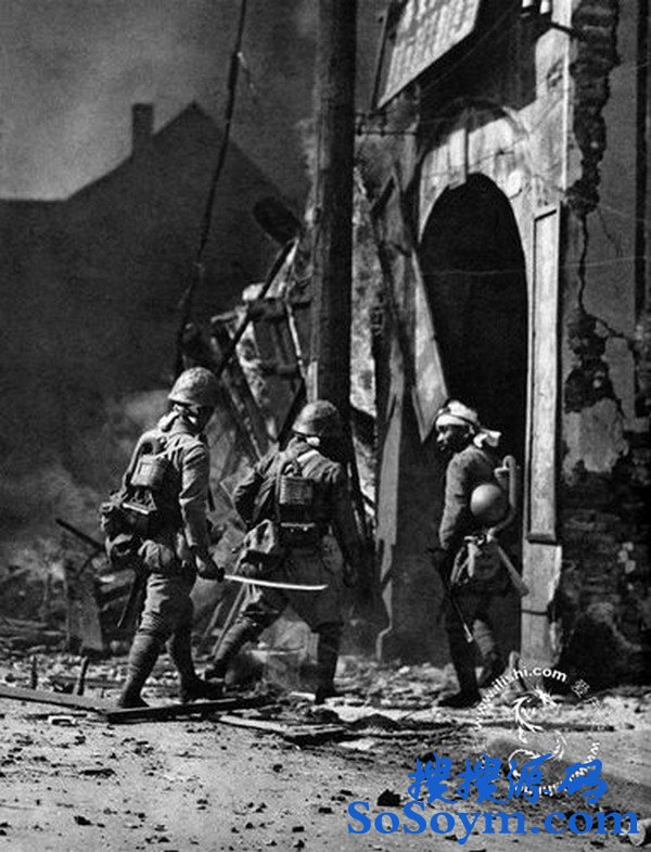 1937年10月,日军在上海闸北战斗中与中国军队进行激烈巷战,图为一名日军拔出武士刀,杀气腾腾,准备进屋搜索。