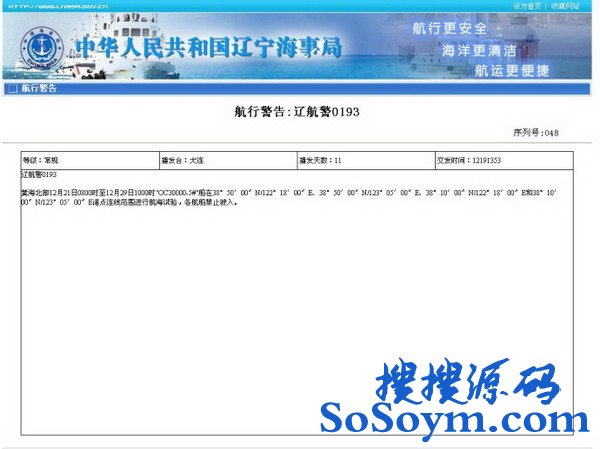根据大连当地网友拍摄的照片显示,刚刚结束第二次试航不久的瓦良格号航母平台今天下午再次出海。同时,辽宁省海事局也登出了“辽航警193”号航行警告,称黄海北部12月21日0800时至12月29日1000时"OC30000-5#"船在38°50′00″N/122°18′00″E、38°50′00″N/123°05′00″E、38°10′00″N/122°18′00″E和38°10′00″N/123°05′00″E诸点连线范围进行航海试验,各航船禁止驶入。
